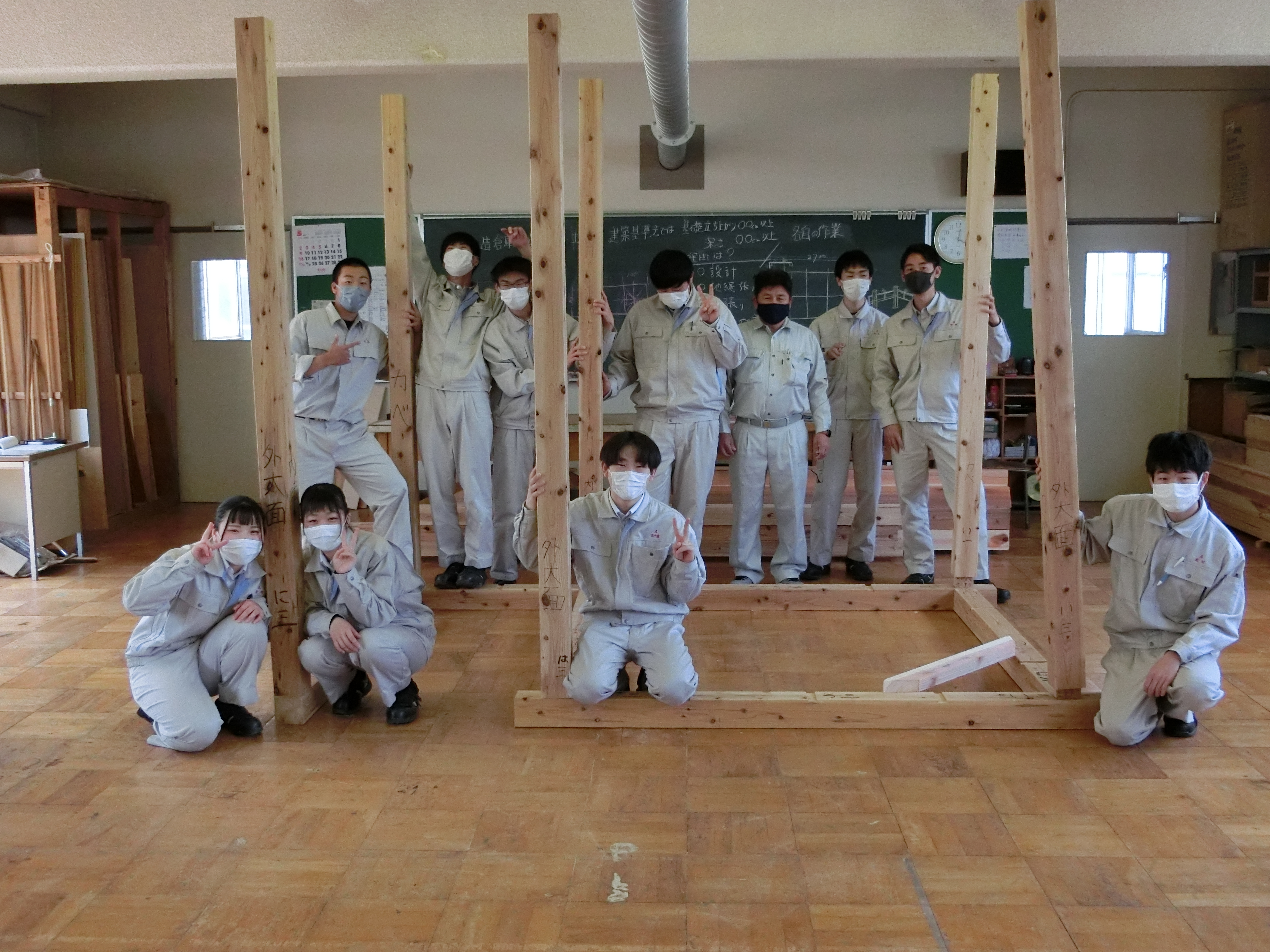 柱ホゾ・火打土台・棟・桁・妻梁の加工も終わり生徒と集合写真を撮りました。